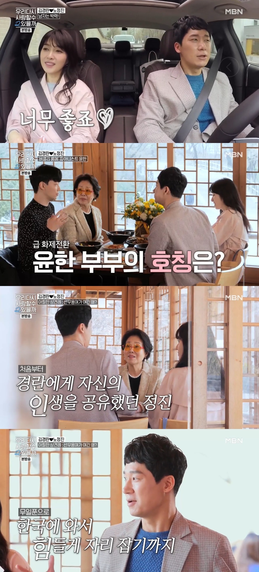 13일 오후 방송된 mbn 예능 프로그램 '우리 다시 사랑할 수 있을까 2'('우다사2')에서 '우다사 시스터즈' 이지안, 박은혜, 김경란, 유혜정, 박현정은 처음으로 부산 단합대회를 떠났다. '우다사2' 김경란♥노정진, 눈물로 진심 확인하며 시즌2 종료 '해피엔딩'. 노정진, 김경란 전 아나운서 향한 직진 02:34 이은혜. '우다사2' 김경란♥노정진, 첫 입맞춤 경란 씨에게 엄마 느낌 났다kpop world의 인사!kpop world 연예 뉴스 채널에 온 것을 환영한다. 김경란, 노정진/사진=mbn '우리 다시 사랑할 수 있을까2' 영상 캡처.